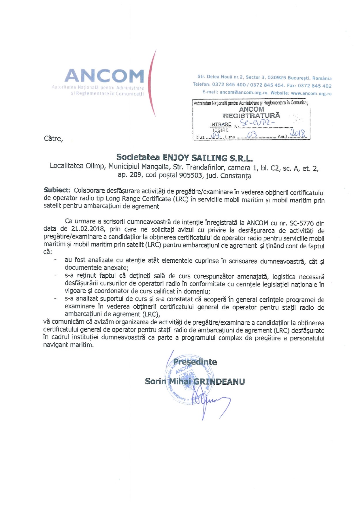 Enjoy Sailing organizeza sesiuni de cursuri autorizate ANCOM pentru obtinerea certificatului de operator radio GMDSS-LRC in Bucuresti si Mangalia, cu durata de 1 zi.